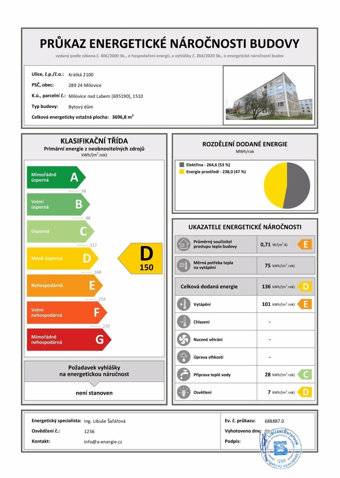 Nabízíme Vám na prodej byt 3+1, 64 m2 v obci Milovice - lokalita Boží Dar (ulice Krátká). Byt je umístěn v 1. NP v panelovém domě bez výtahu. Byt je předělán z původního 2+1 na nynější dispozici 3+1 (stavebně rozděleno sádrokartonovou příčkou s větracím okénkem na ložnici a dětský pokoj). V bytě se dále nachází obývací pokoj s balkónem. Kuchyň je vybavena linkou, sklokeramickou deskou, elektrickou troubou a digestoří. Nově zrekonstruovaná koupelna (2025) je osazena sprchovým koutem a umyvadlem. Toaleta je umístěna samostatně. Podlahovými krytinami jsou plovoucí podlahy a dlažba. Bytová jednotka je vytápěna centrálním tepelným čerpadlem. K bytu náleží sklep. V blízkosti domu se nachází les a cyklostezky (velice klidná lokalita). Bezproblémové parkování kolem domu je další výhodou této nemovitosti. Veškerá občanská vybavenost je v přilehlé obci Milovice - úřady, lékaři, školy, školky, obchodní domy, služby, a hlavně přímý vlakový spoj do centra Prahy. Velice dobrá dostupnost automobilem je i do Prahy a Mladé Boleslavi (D10 a D11). Nemovitost je možno financovat hypotéčním úvěrem, který Vám rádi zprostředkujeme.